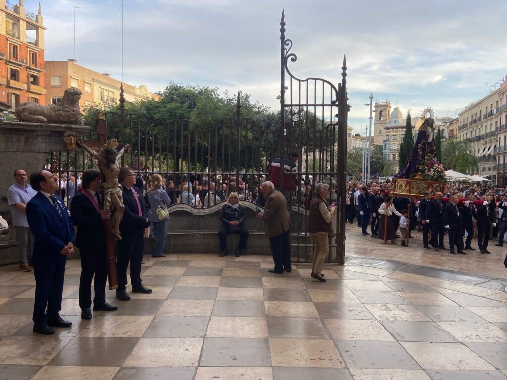 El acto central estuvo presidido por el obispo auxiliar de Valencia, Fernando Ramón, y se estructuró en tres momentos clave: la concentración en la Plaza de la Almoina, la procesión hasta la Catedral con acompañamiento musical de banda cofrade y la posterior celebración de la Eucaristía en la Puerta de los Hierros.
