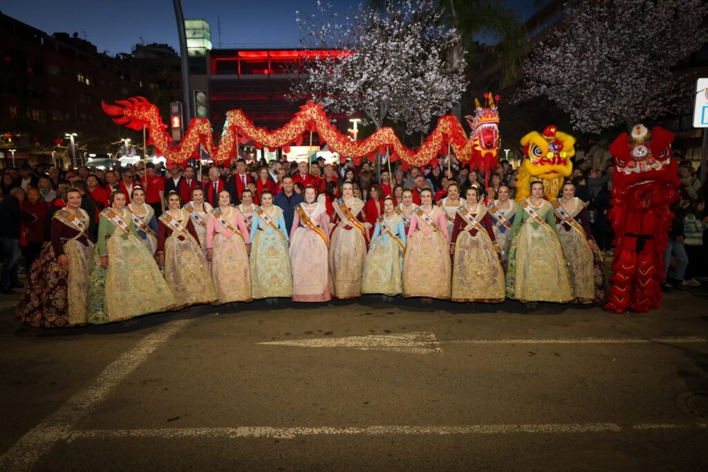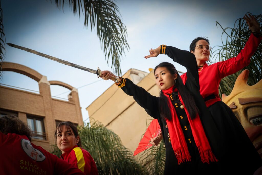 Després de la representació institucional, la desfilada va donar pas a una explosió de tradició i simbolisme. Dones abillades amb vestits tradicionals xinesos van desfilar al costat de dos grans lleons de vius colors i un imponent drac que va interactuar constantment amb el públic, especialment amb els més xicotets. El Centre Cultural Shaolin València va oferir exhibicions d’arts marcials que van despertar l’admiració dels assistents.