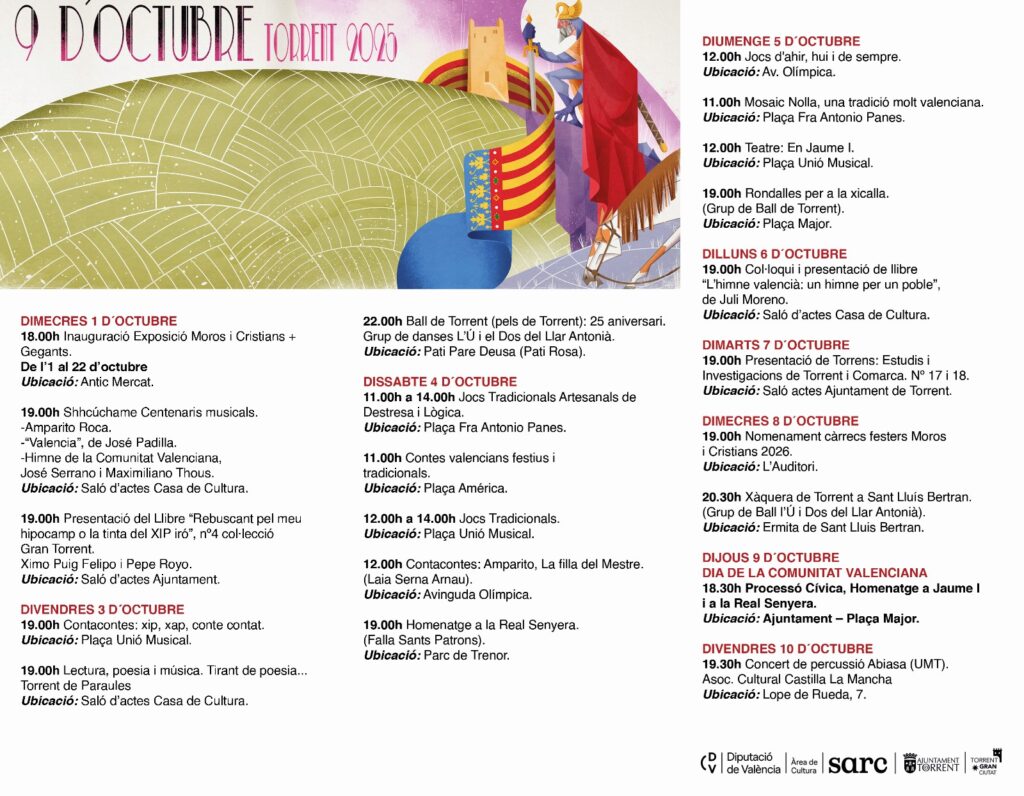 Al mateix temps, el programa reforça l’oferta cultural amb concerts, lectures poètiques, exposicions i presentacions de llibres, que es combinen amb les tradicions festives més arrelades com el Ball de Torrent o els homenatges a la Real Senyera. Tot això culminarà el 9 d’octubre.