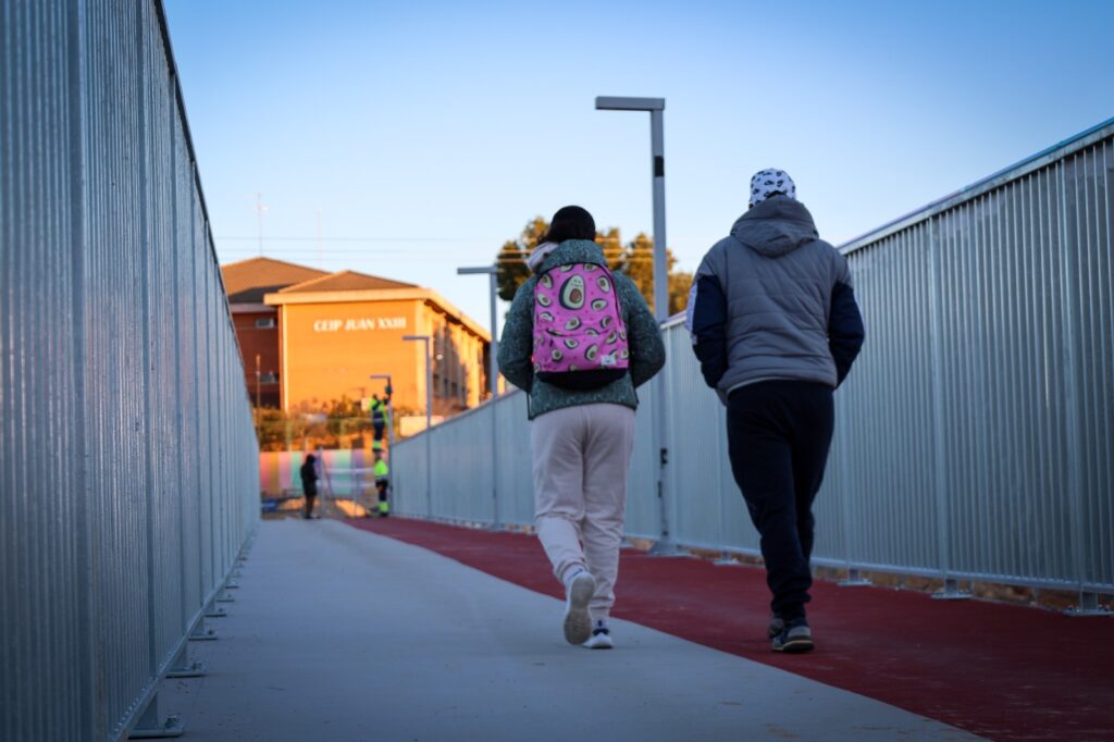 La passarel·la es troba oberta i operativa al trànsit per als vianants, permetent recuperar la connexió habitual entre el barri i el centre educatiu, així com amb altres dotacions de l’entorn. La seua entrada en servici suposa un pas decisiu en la normalització del dia a dia de centenars de persones que utilitzen este itinerari de manera quotidiana.