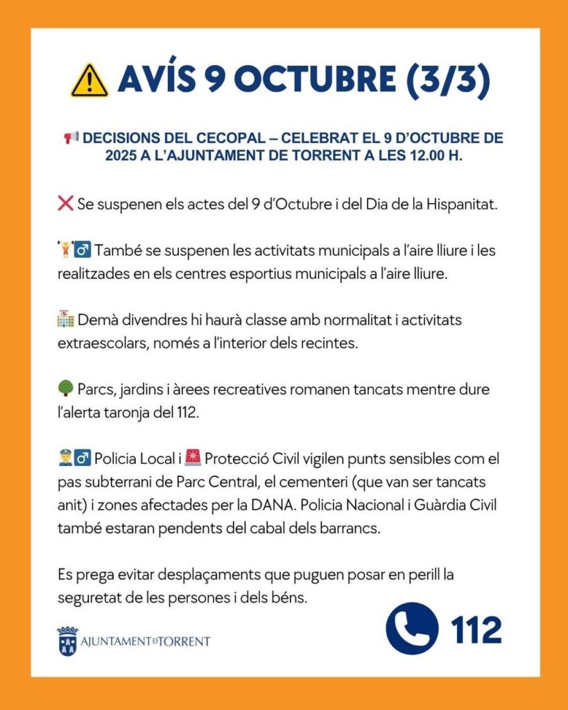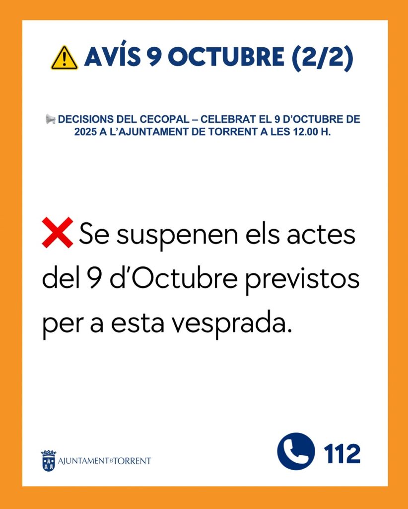 Se suspenen els actes previstos per a la vesprada del 9 d’Octubre i Dia de la Hispanitat, així com activitats municipals i esportives a l’aire lliure.
