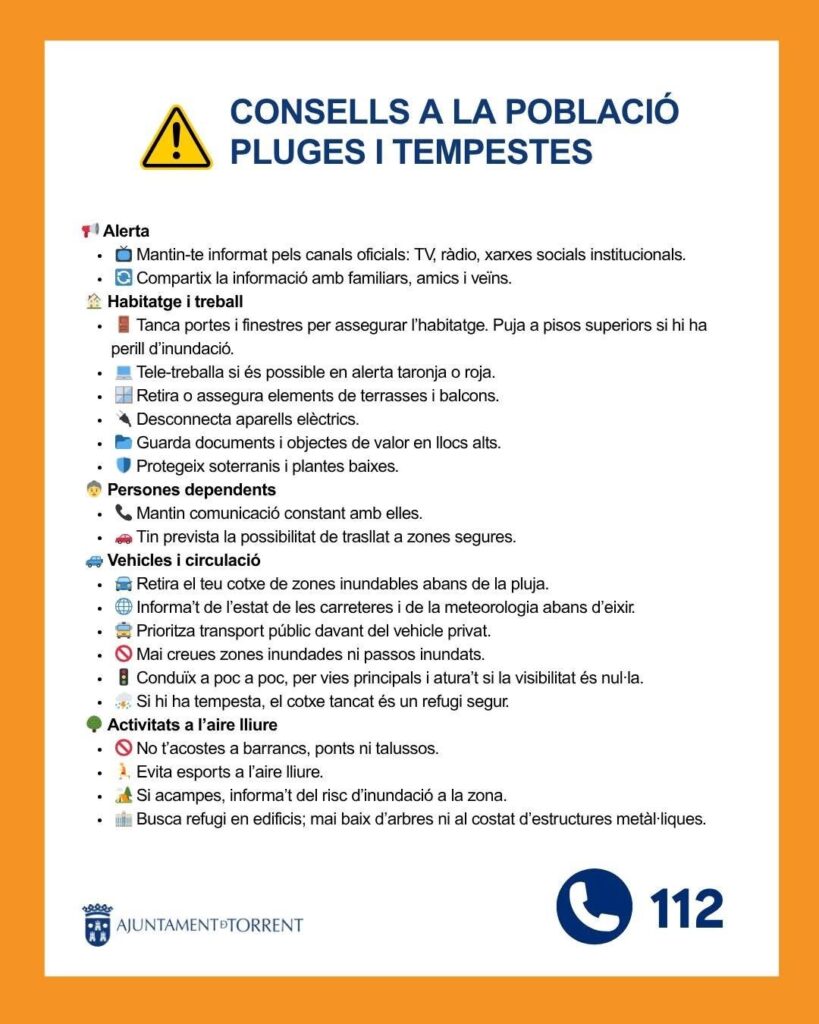 L’Ajuntament recorda a la ciutadania que evite desplaçaments innecessaris, que no accedisca a zones inundables ni travesse barrancs o passos subterranis, i que es mantinga informada a través dels canals oficials AEMET i 112CV i canals oficials de l’Ajuntament de Torrent. Així mateix, l’ajuntament ha enviat per totes les xarxes socials i canals d’informació recomanacions a la ciutadania.