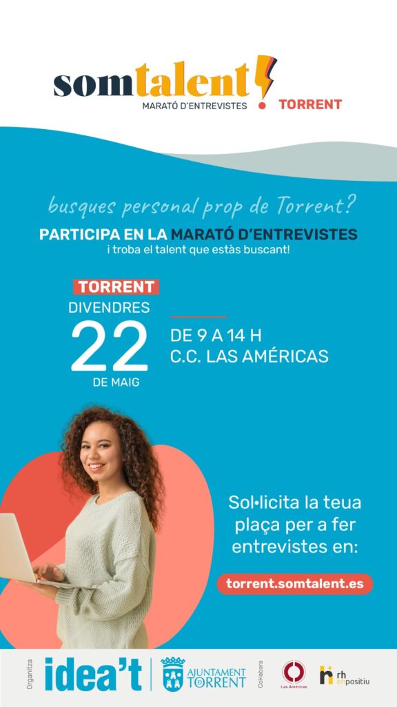 El Ayuntamiento de Torrent, a través de IDEA’T (Innovació i Desenvolupament Económic Actiu Torrent), organiza una nueva edición de “Som Talent. Marató d’Entrevistes”, un evento consolidado como una de las principales iniciativas de fomento del empleo en el municipio. La jornada se celebrará el próximo viernes 22 de mayo, de 9:00 a 14:00 horas, en el Centro Comercial Las Américas, y reunirá a decenas de empresas y candidatos en un mismo espacio para facilitar procesos de selección ágiles y eficaces. lA nueva edición cuenta con la colaboración del Centro Comercial las Américas y la empresa RH en positiu, empresa consultora de recursos humanos.