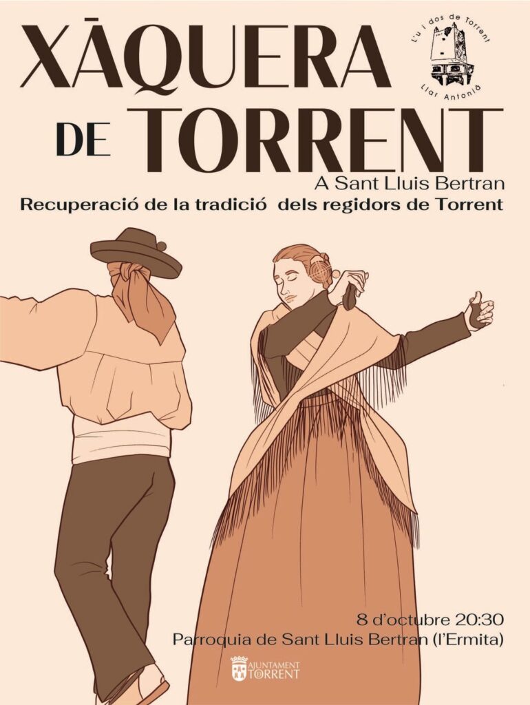 La tradición vuelve a las calles de Torrent con la representación de la Xàquera, una de las danzas más antiguas y emblemáticas de la ciudad, que se celebrará mañana miércoles 8 de octubre, a las 20:30 horas, en la entrada de la Ermita de San Luis Bertrán. El acto, organizado por el Grup de Ball l’Ú i Dos del Llar Antonià, forma parte de la programación conmemorativa del 9 d’Octubre, Día de la Comunitat Valenciana, y supone una nueva oportunidad para revivir una tradición que forma parte de la identidad torrentina.