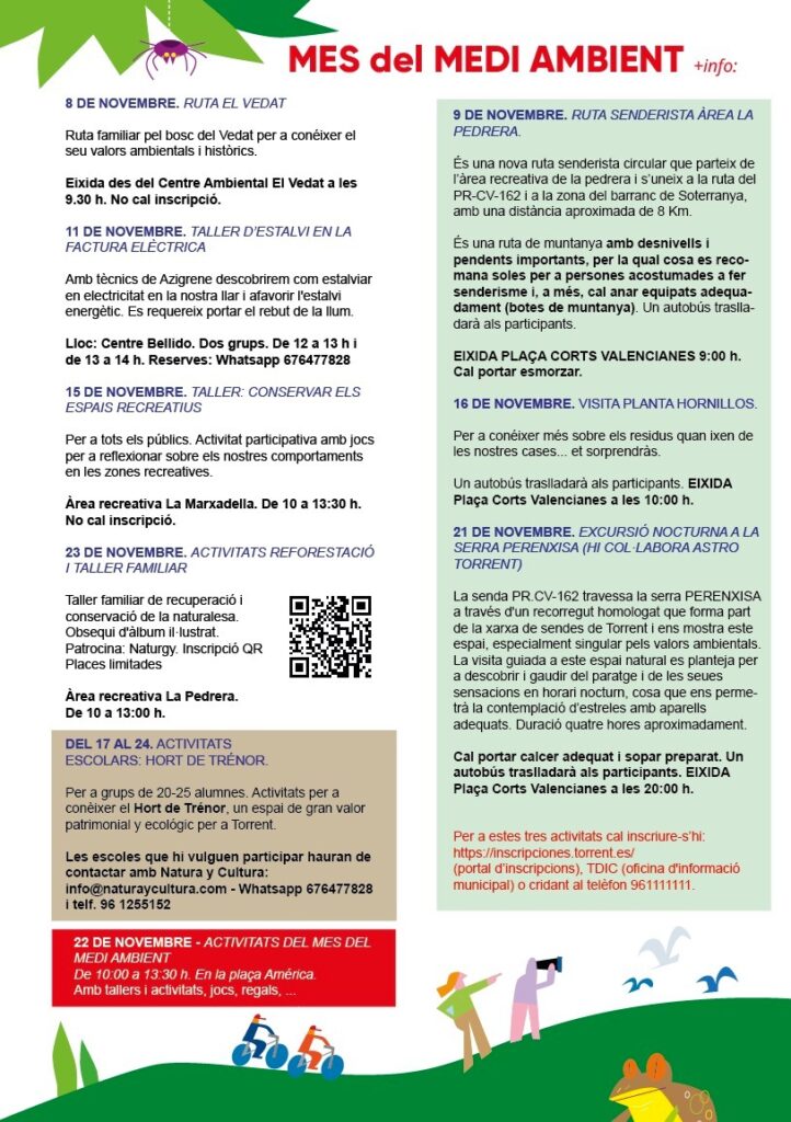 El Ayuntamiento de Torrent, a través de la delegación de Medio Ambiente, celebra del 8 al 23 de noviembre la Semana del Medio Ambiente 2025, y que este año llega cargada de actividades para todos los públicos: talleres familiares, rutas guiadas, jornadas escolares, una exposición sobre biodiversidad y sesiones prácticas de eficiencia energética.