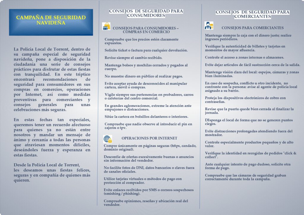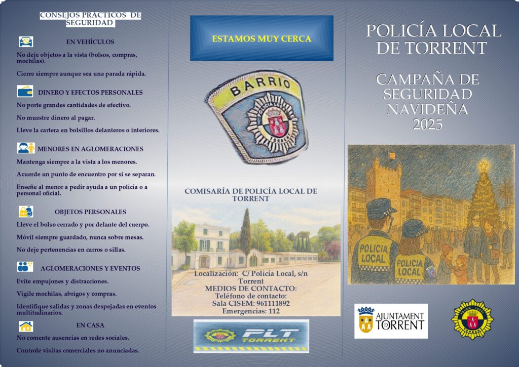 La Policía Local de Torrent ha puesto en marcha su Campaña Especial de Seguridad Navideña 2025, una iniciativa informativa y preventiva destinada a reforzar la protección de la ciudadanía y del comercio local durante unas semanas en las que se incrementa notablemente la actividad comercial, la presencia de vecinos en las calles y las aglomeraciones en eventos festivos.